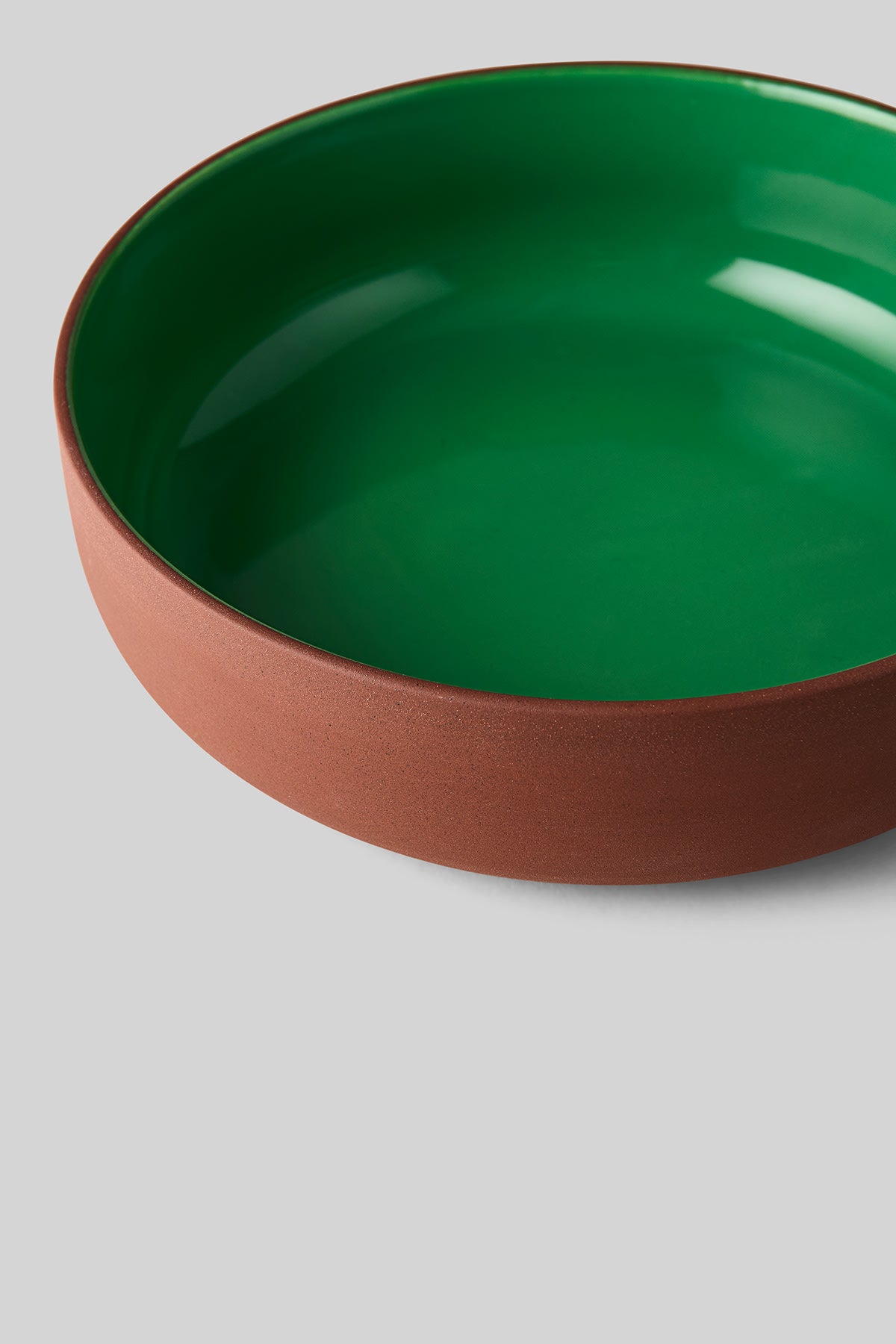 This terracotta/green serving bowl is made of partially glazed clay. The bowl has a raw outer surface in beautiful terracotta clay, while its inner surface features a stylish green glaze. The ceramic bowl is large and has a high rim, making it suitable for larger dishes, salads, and fruit.