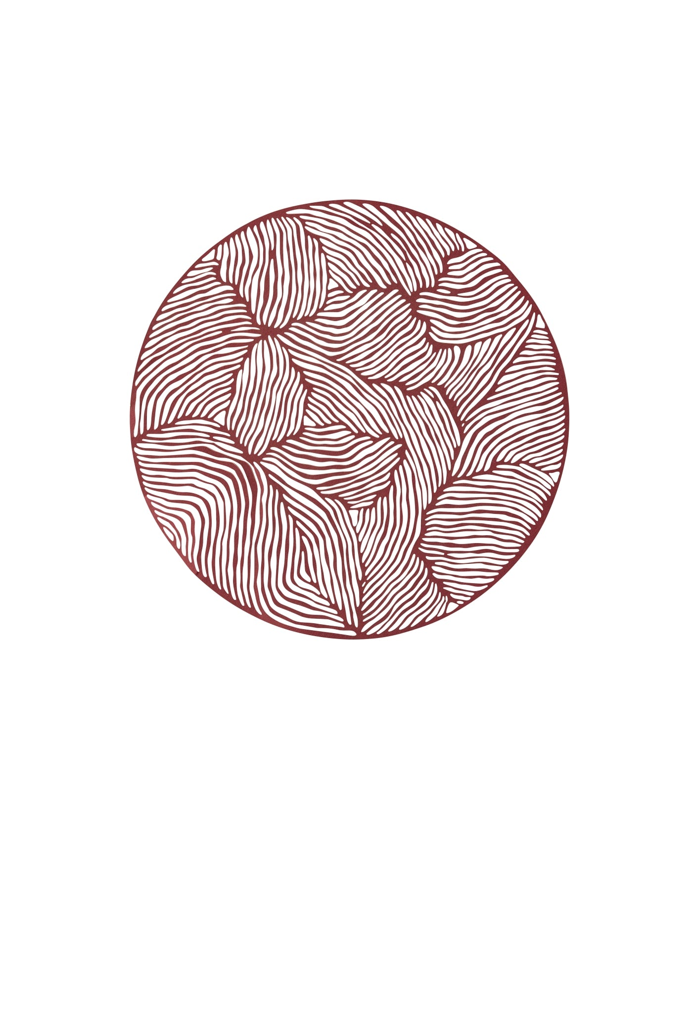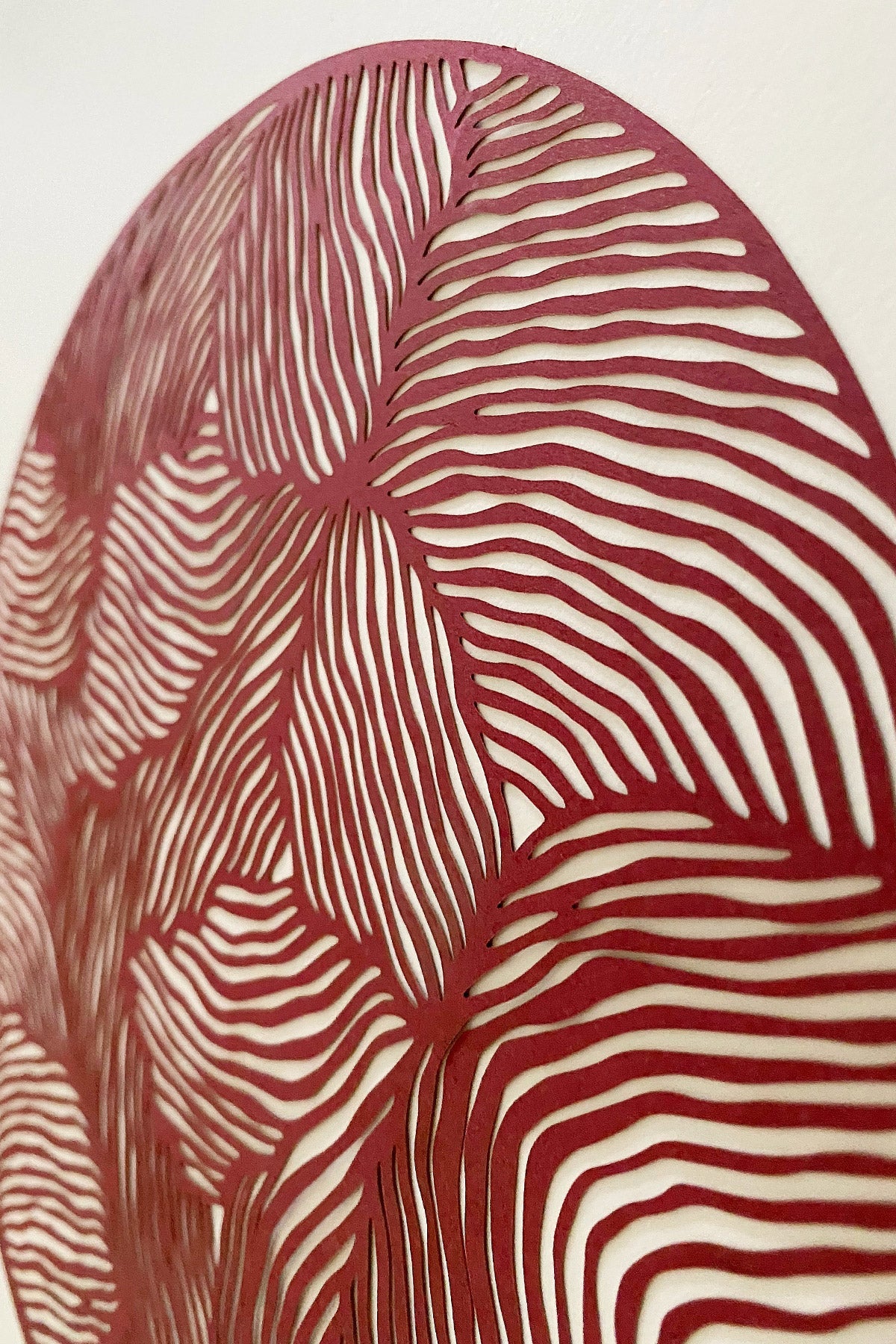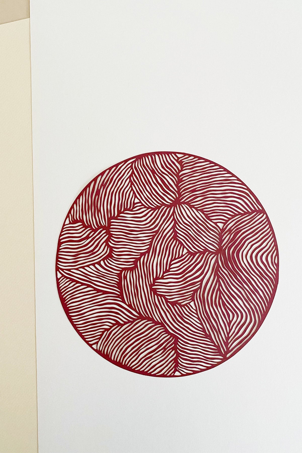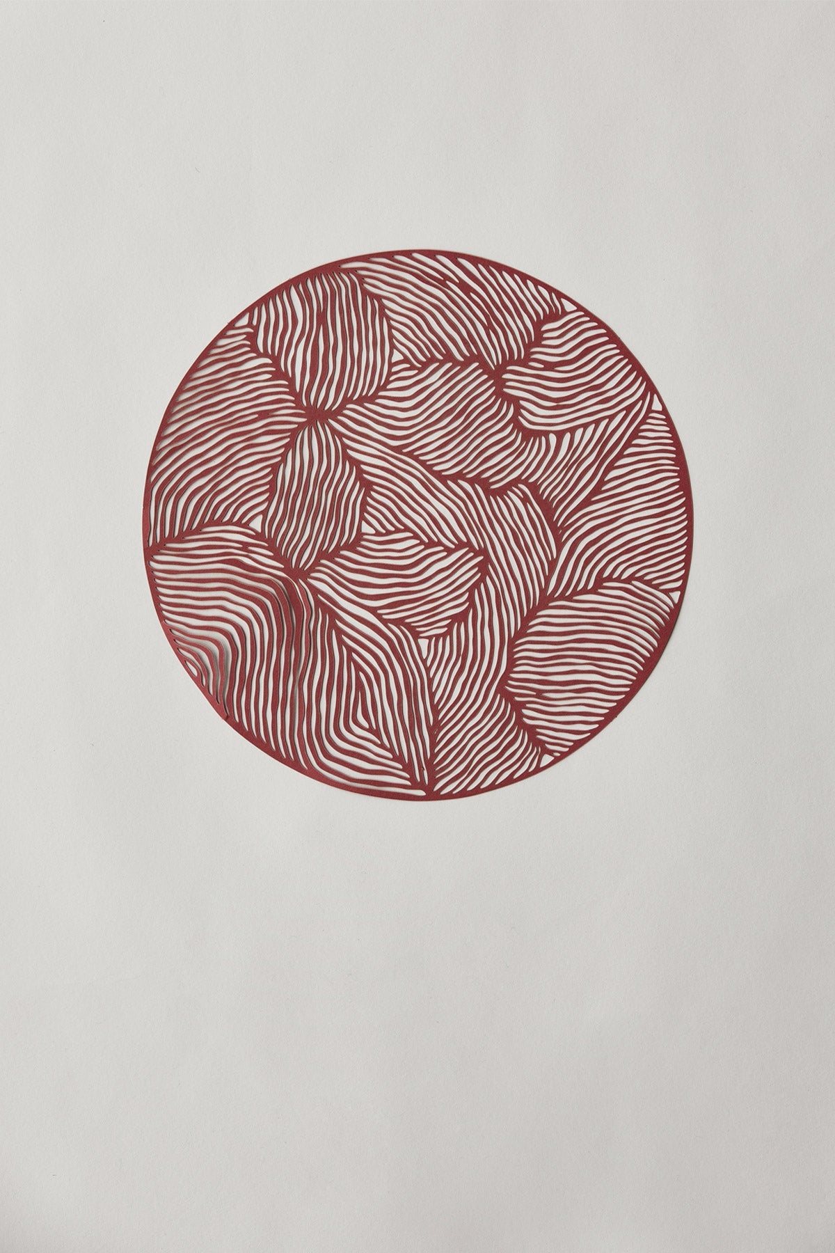 PAPERCUT is a new collaboration with the Danish paper art designer Little Detroit. These elegant papercuts play with light and shadow. They fit in the FRAMELESS frame from Studio About but can be used in all kinds of frames. This round papercut is in the colour bordeaux. There is a total of 11 different designs in this collection.