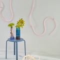 The lamp has a minimalist design, but transforms into an innovative designer lamp and a unique artwork with its flexible shape. It invites to artistic expression and experimentation and encourages you to play with its flexibility. The possibilities are many, as it can be used as a wall lamp, table lamp, or ceiling lamp. You can create a personal and unique pattern on the wall with the included mounts; let the lamp hang in its natural curves for an organic expression. It can also be used as a dining table lamp by hanging a tube horizontally from the ceiling and wrapping the lamp around it, draping it in undulating movements. You can fold it around itself and place it on a shelf, chair, or table as a beautiful centerpiece. The lamp is therefore functional, practical, and decorative, as it provides both light and movement to your home.