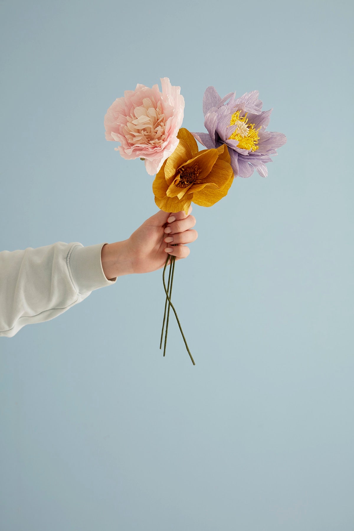 The paper flowers from Studio About are handmade and carefully folded into small tubes. When you receive your flower, unfold the leaves yourself to bring it to life. The crepe paper is easy to shape, so you can adjust the look of the flower and give it a personal touch.