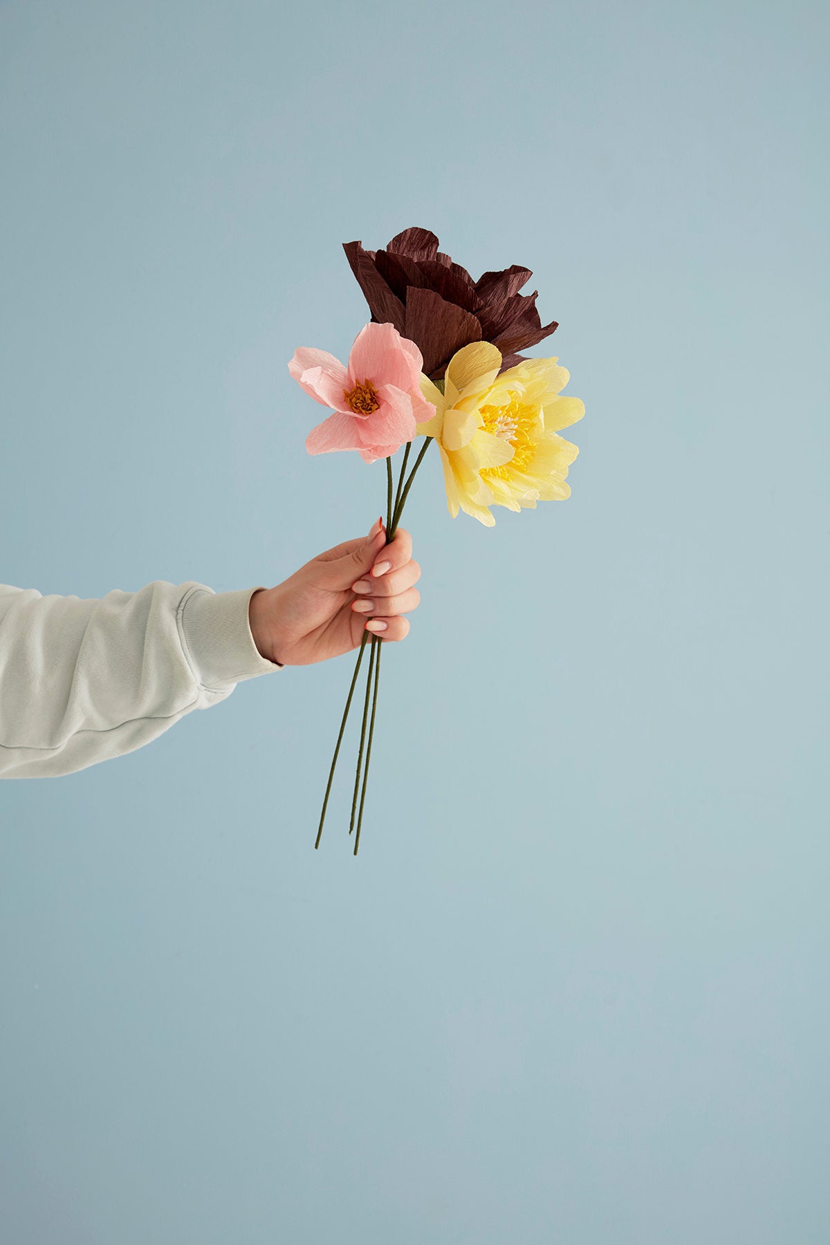 The paper flowers from Studio About are handmade and carefully folded into small tubes. When you receive your flower, unfold the leaves yourself to bring it to life. The crepe paper is easy to shape, so you can adjust the look of the flower and give it a personal touch.