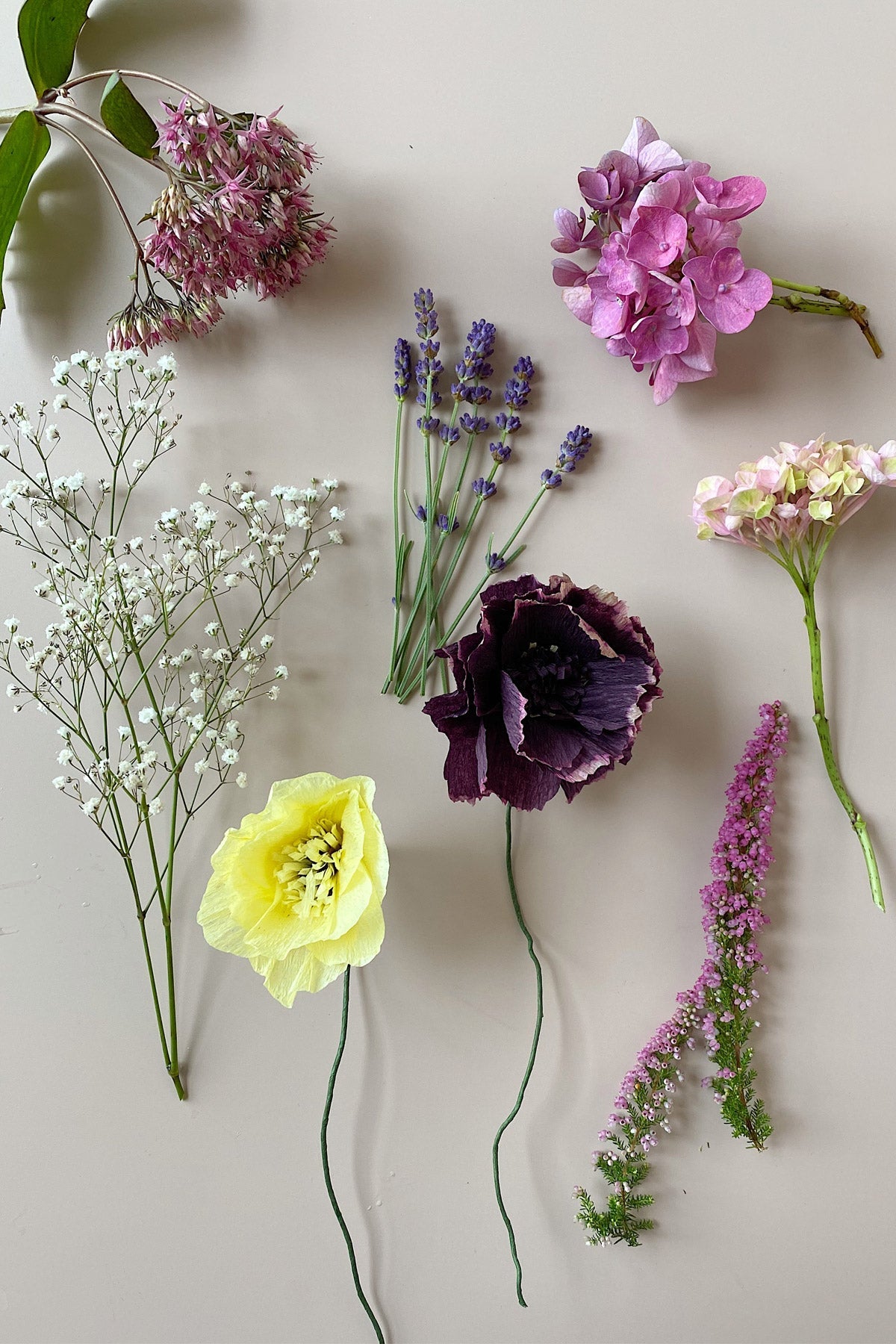 Sie können Ihre Papierblumen auch mit Trockenblumen in allen möglichen Farben kombinieren, sie verleihen einen starken Ausdruck und eignen sich hervorragend als Geschenk für die Gastgeberin oder einfach als Dekoration zu Hause im hektischen Alltag. Versuchen Sie zum Beispiel, die schönen Kreppblüten mit einigen getrockneten Gräsern zu kombinieren.