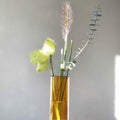 Die Glasvase hier hat eine schöne gelbe Farbe und eine Höhe von 20 cm. Die Vase besteht aus zwei Teilen - einer farbigen Glasvase, die in einem transparenten Glaszylinder ruht. Das Design verleiht der Vase einen skulpturalen und schwebenden Ausdruck und fügt sich auf natürliche Weise in die nordische Raumgestaltung ein.