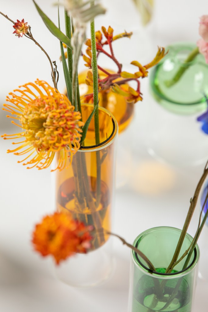 Wenn der Garten in voller Blüte steht und es auf den Märkten Blumen und Sträuße in Hülle und Fülle gibt, ist es an der Zeit, etwas von der Schönheit ins Haus zu holen und einen kleinen Strauß für die Glasvase zu kreieren. Blumenröhren-Glasvasen können gut allein stehen, wirken aber noch eindrucksvoller in einer kleinen Ansammlung verschiedener Farben und Größen. Spielen Sie mit der Farbe und Größe der Blumen und fügen Sie Ihrer Einrichtung ein kleines farbenfrohes Stillleben hinzu.