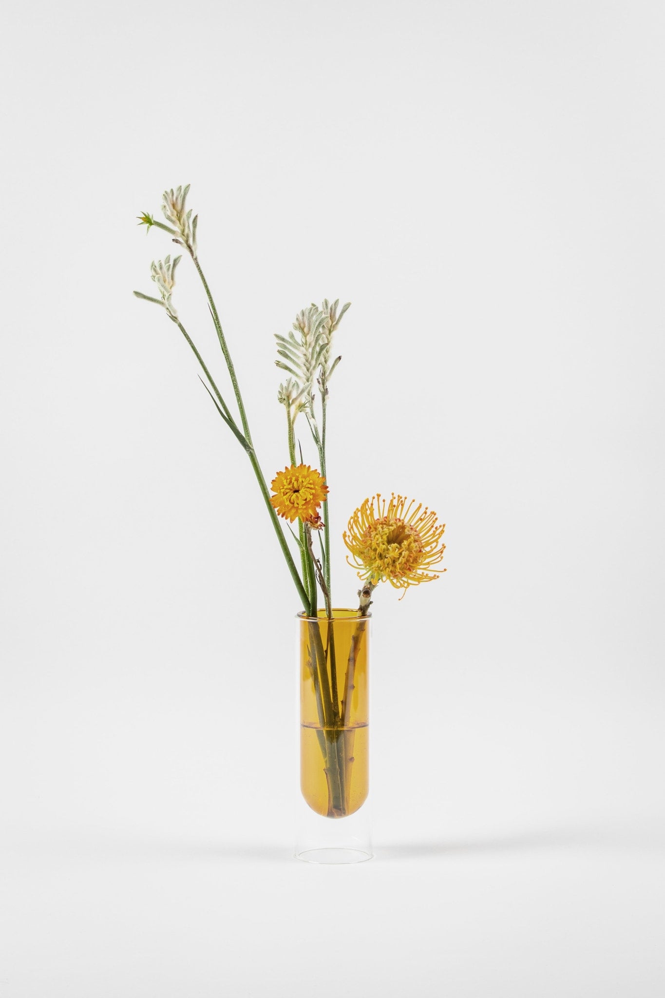Die Glasvase hier hat eine schöne gelbe Farbe und eine Höhe von 20 cm. Die Vase besteht aus zwei Teilen - einer farbigen Glasvase, die in einem transparenten Glaszylinder ruht. Das Design verleiht der Vase einen skulpturalen und schwebenden Ausdruck und fügt sich auf natürliche Weise in die nordische Raumgestaltung ein.