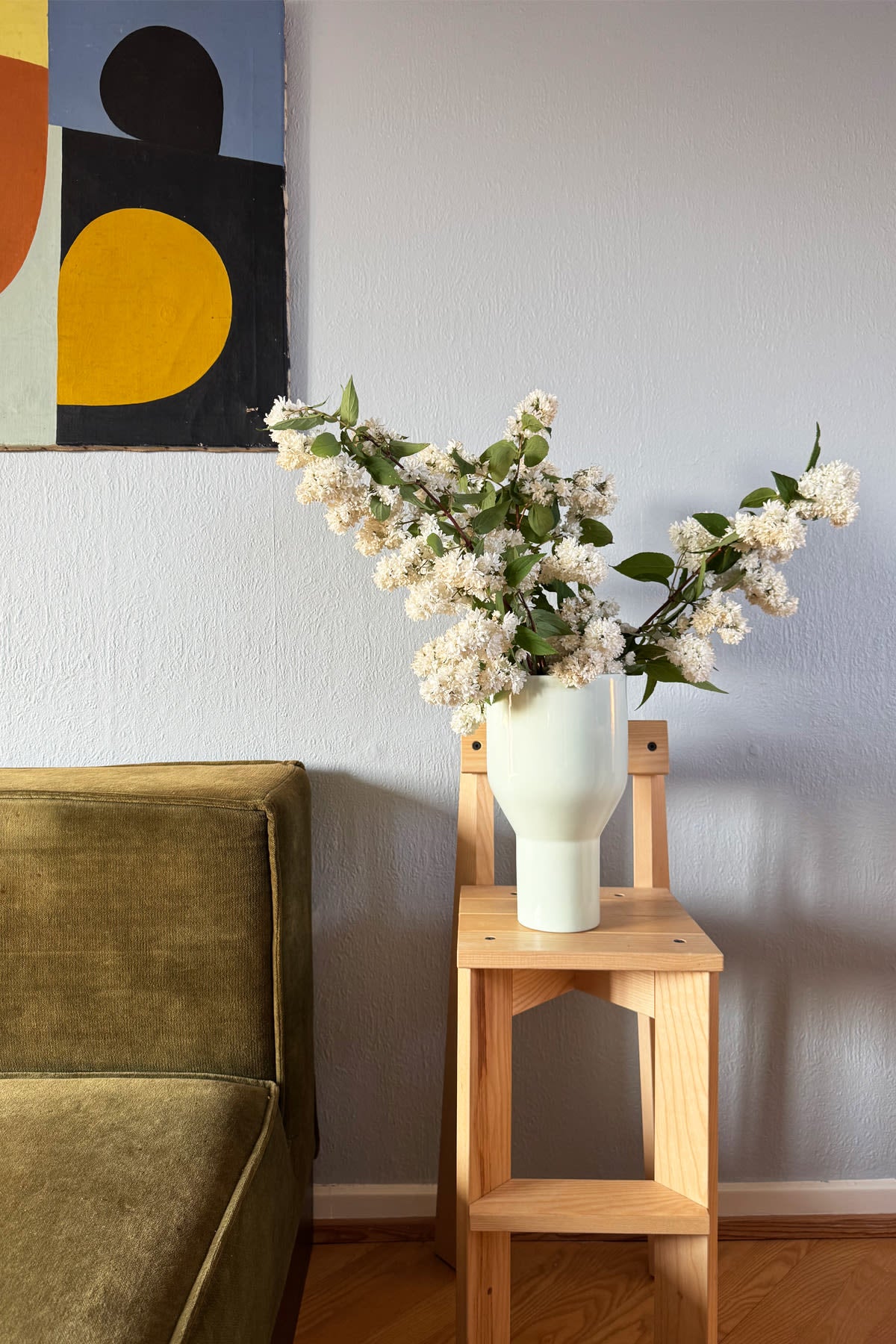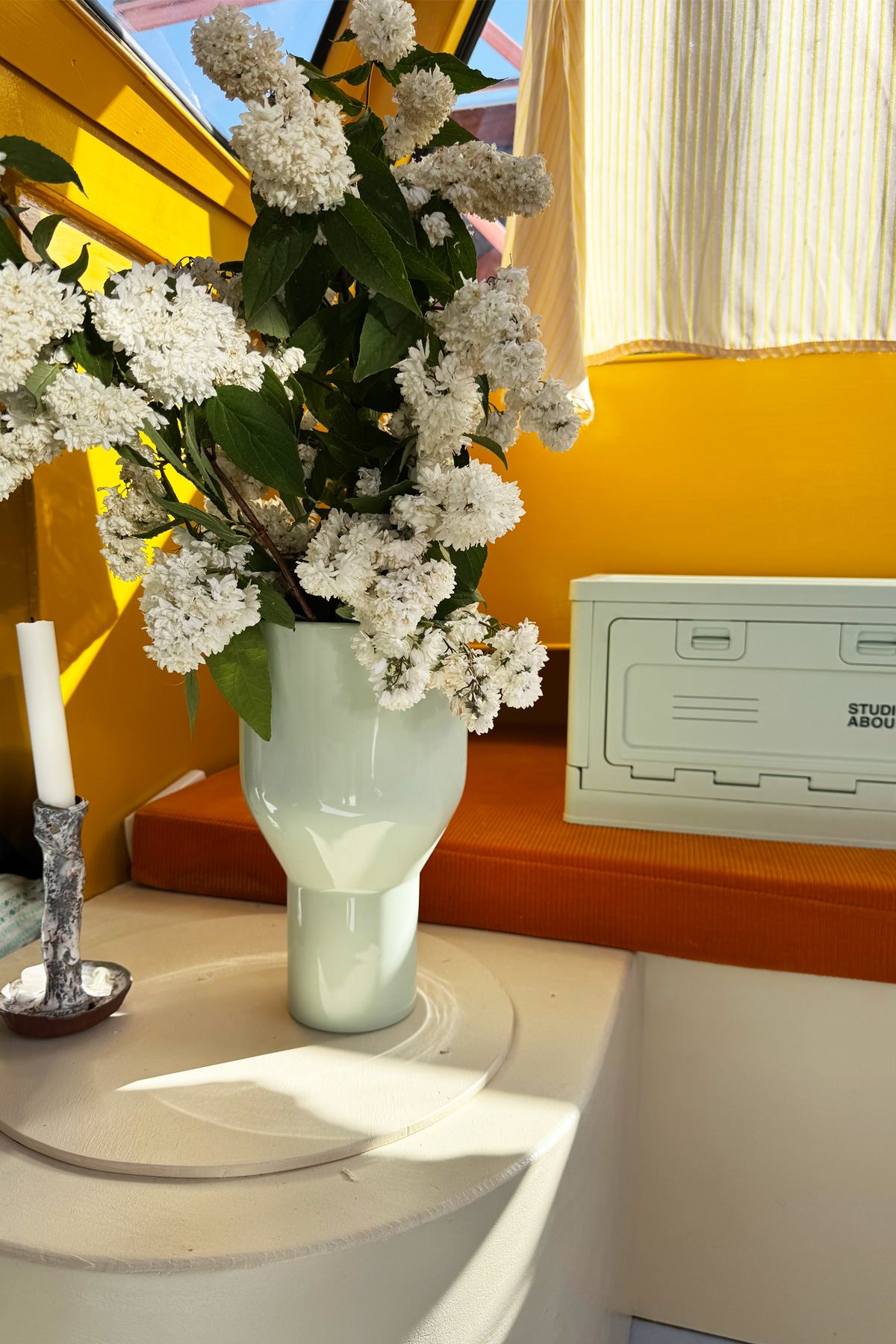 Platziere FLOWERSHADE als Mittelpunkt auf dem Esstisch, im Regal oder auf der Fensterbank. Kombiniere sie mit unseren Papierblumen für einen farblich abgestimmten, langlebigen Akzent – oder mit frischen Blumen der Saison für einen lebendigen Kontrast. Die Vase eignet sich auch ideal für lange Stiele oder minimalistische Arrangements.
