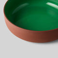Die terracotta/grüne Servierschale wird aus Ton hergestellt und ist teilweise glasiert. Die Schale hat eine rohe Außenseite in schönem Terrakotta-Ton und eine stilvolle grüne Glasur auf der Innenseite. Die Keramikschale ist groß und hat einen hohen Rand, so dass sie mehr fassen kann.