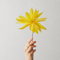 Diese Blume ist aus gefärbtem Krepppapier gefertigt und auf einem langen, biegsamen grünen Stiel montiert. Sie können den Stiel leicht formen, sodass Sie die gewünschte Form und Länge erhalten. Die Blume ist im Allgemeinen von der Kaktusdahlie inspiriert, die ein sternförmiges Aussehen hat und im Garten wie bunte Sterne schön leuchtet – daher der Name Shooting Star.