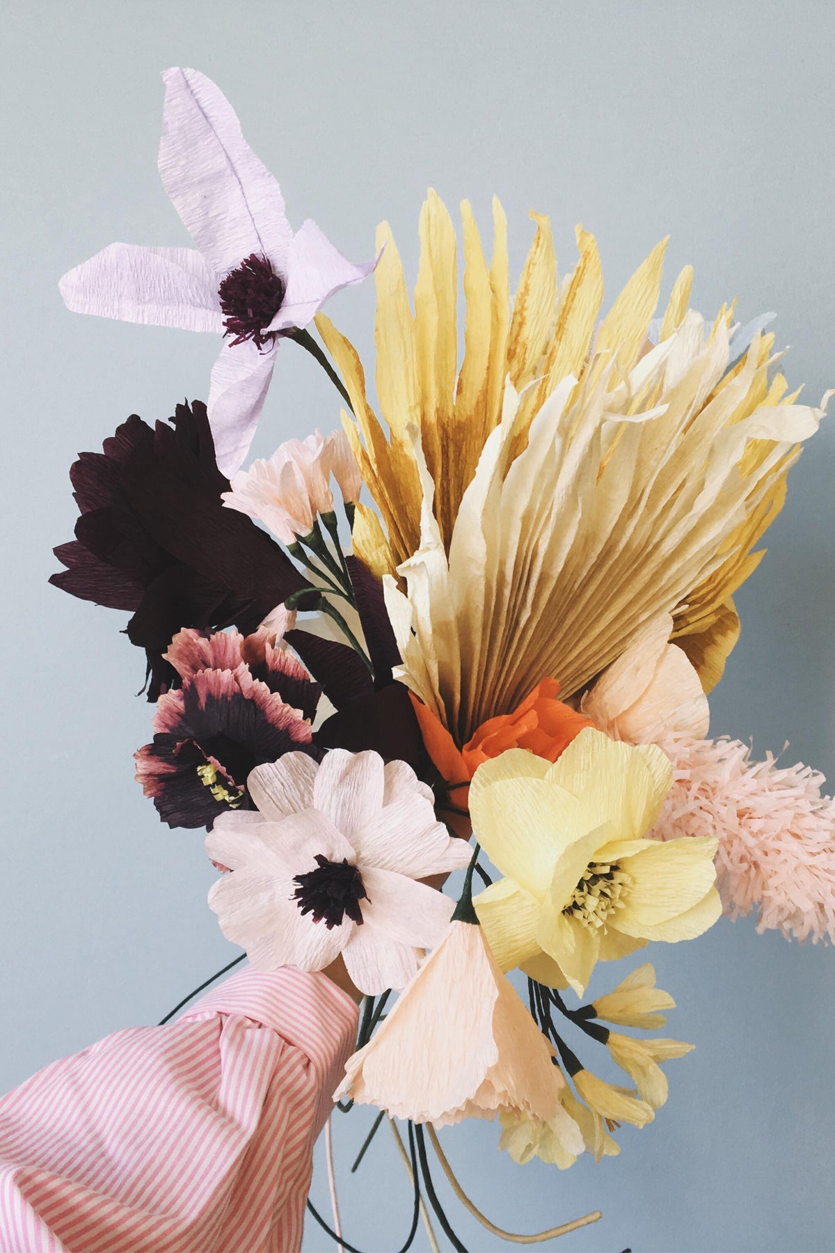 You can also combine your paper flowers with dried flowers in all kinds of colours, it will give a strong expression and is great as a hostess gift or just for decoration at home in a busy everyday life. For example, try combining the beautiful crepe flowers with some dried grasses.