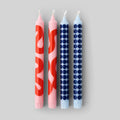 Our signature taper candles are now available in four unique sets – each with carefully composed colour pairings and graphic prints. Every box contains four candles, each with its own pattern, designed to be styled together or stand alone as small, vibrant highlights.
