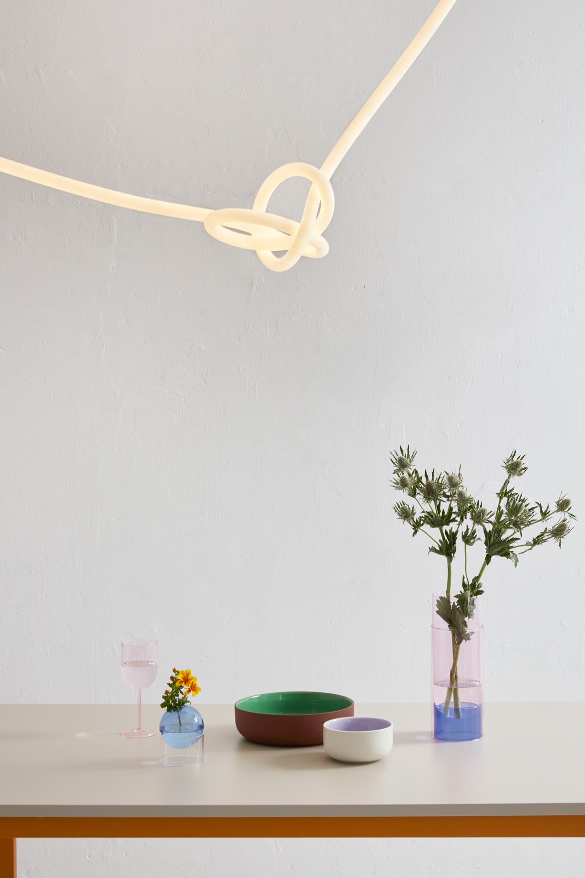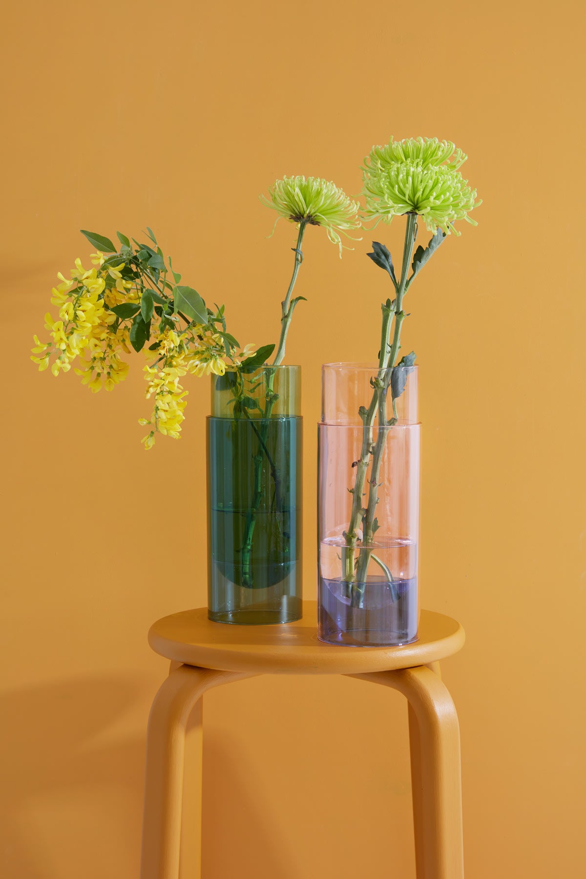 Spread mood and joy with our colored vases. Danish Studio About designs objects with a tight and clear design language and this BOUQUET TUBE is no exception. Designer and architect Mikkel Lang Mikkelsen has this time played with expression and the three-dimensional. Create your own color language by either choosing flowers that compliment the vase or flowers that contrast. The vase is perfect for cherry branches and long-stemmed summer flowers. The strong, colorful glass adds depth and eye-catching appeal to your home decor, and the vase is perfect for displaying on a shelf or bookcase when not in use.