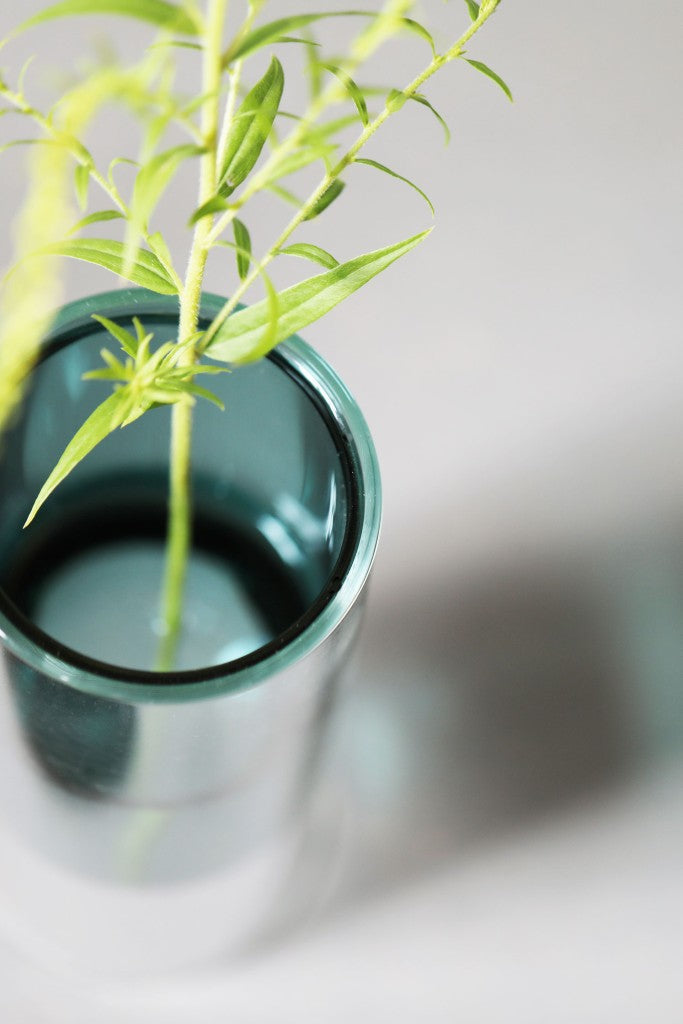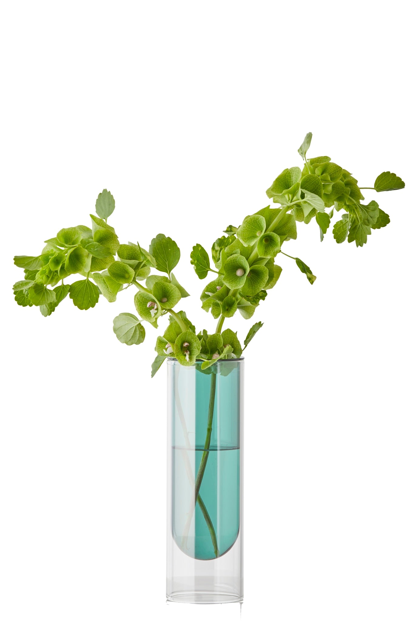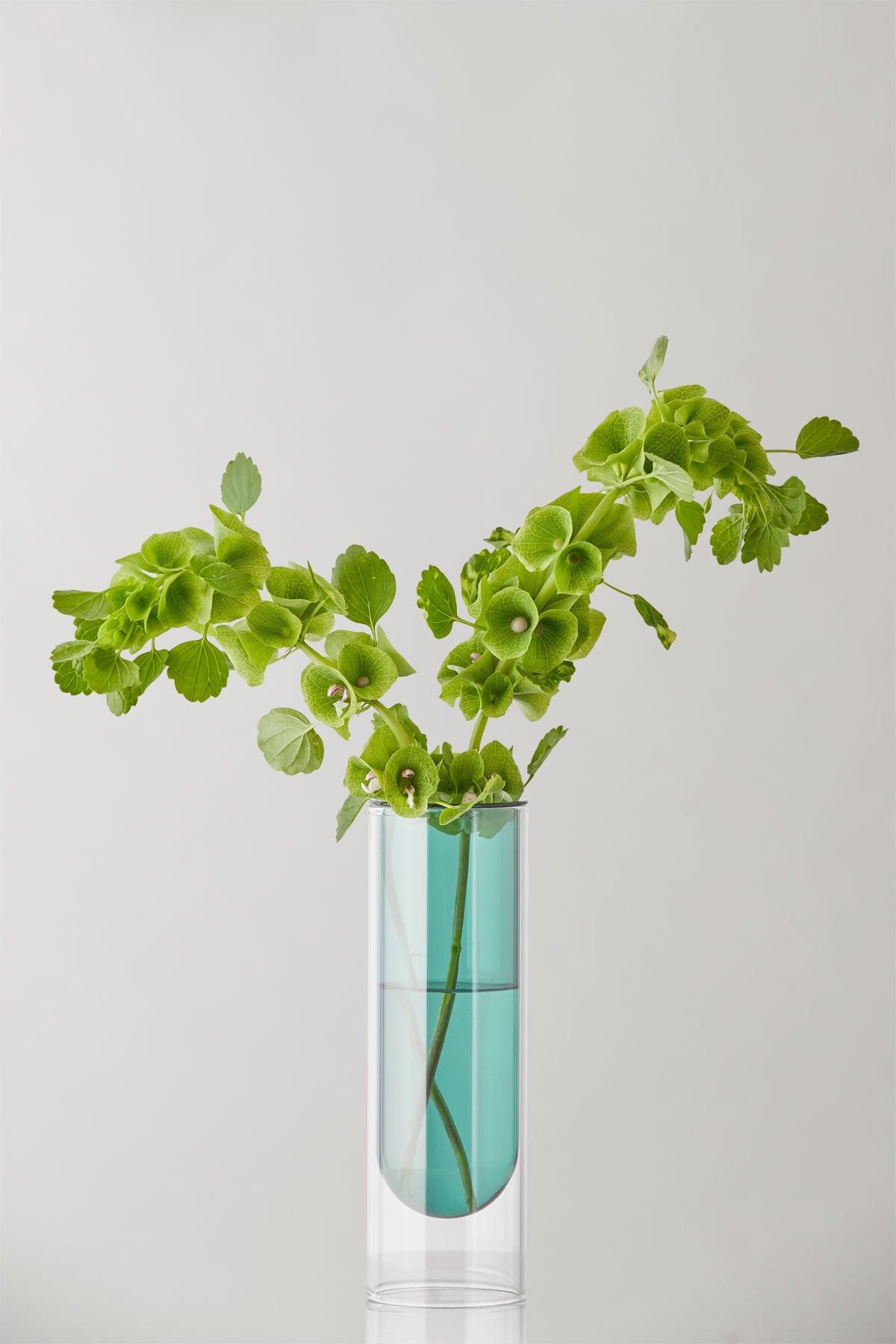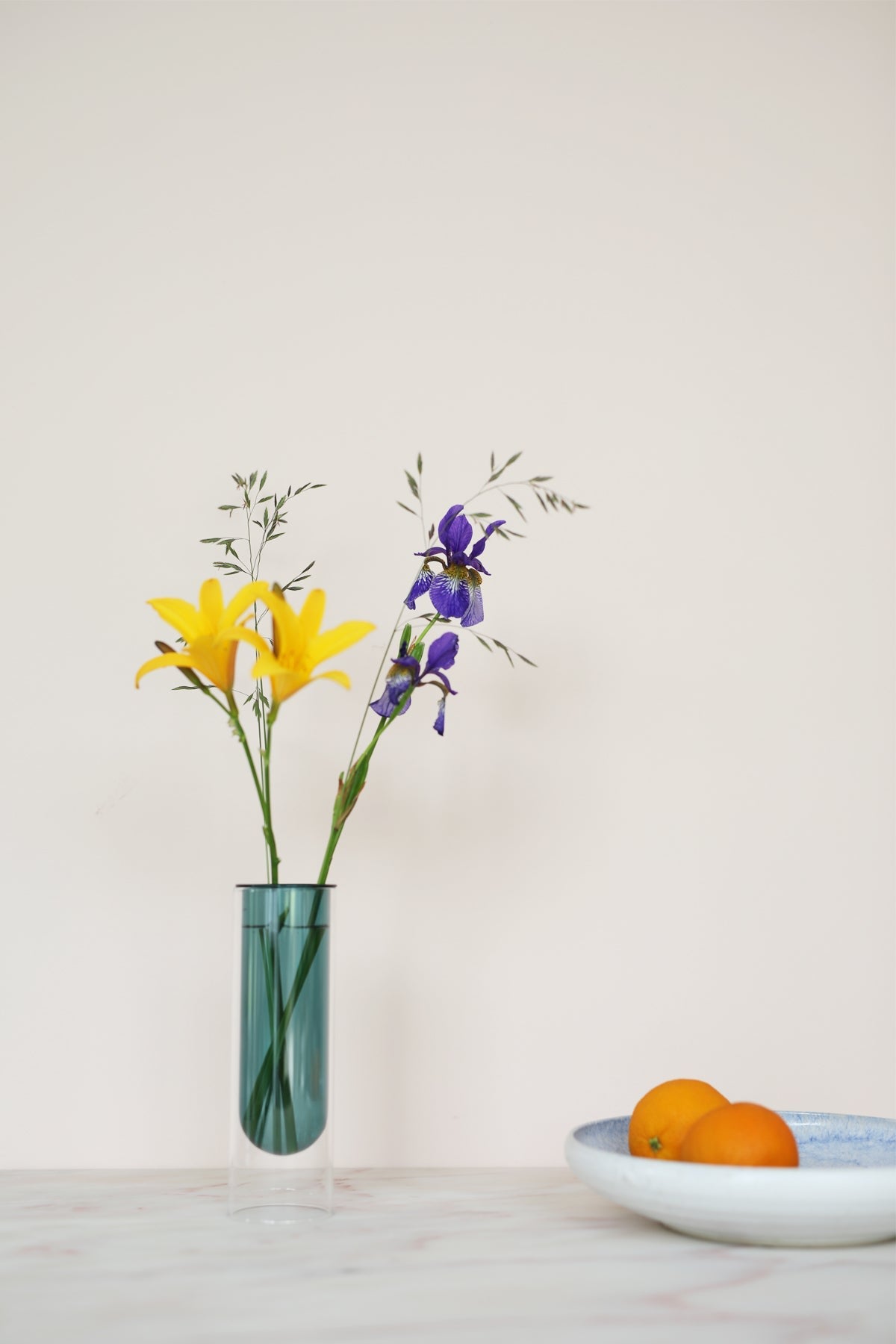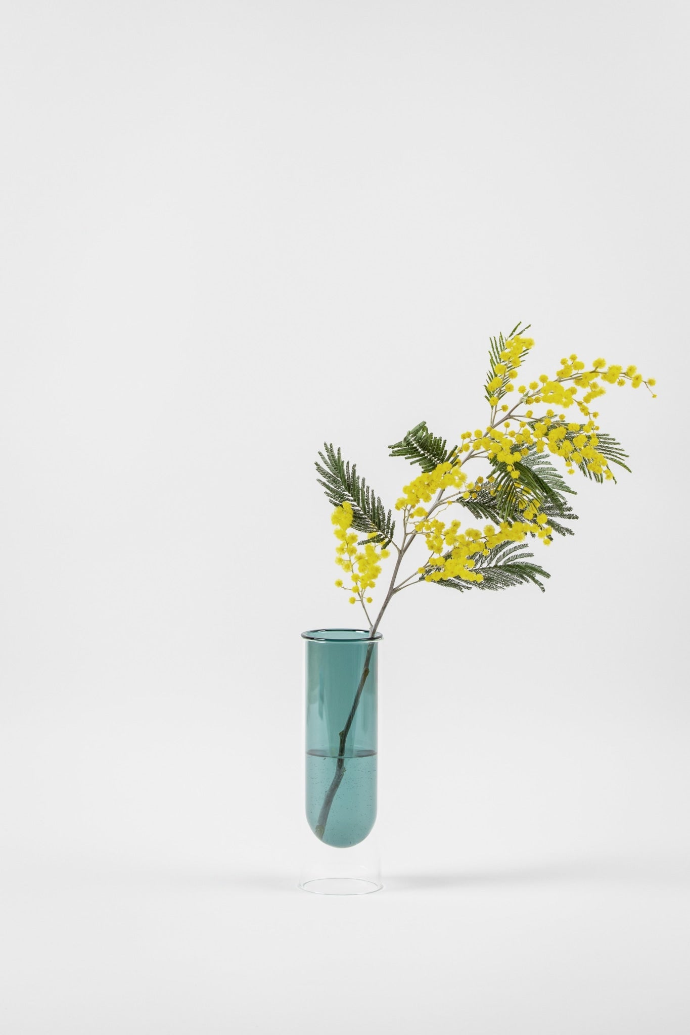 FLOWER TUBE The collection is a series of cylindrical vases designed for small bouquets and individual flowers. They work beautifully with spring branches from the garden too or cuttings so you can shape and create your favourite plant. The vases are available in 2 sizes and consist of a transparent exterior and a coloured interior that makes up the vase itself. This vase is mouth-blown in the glass type borosilicate glass.