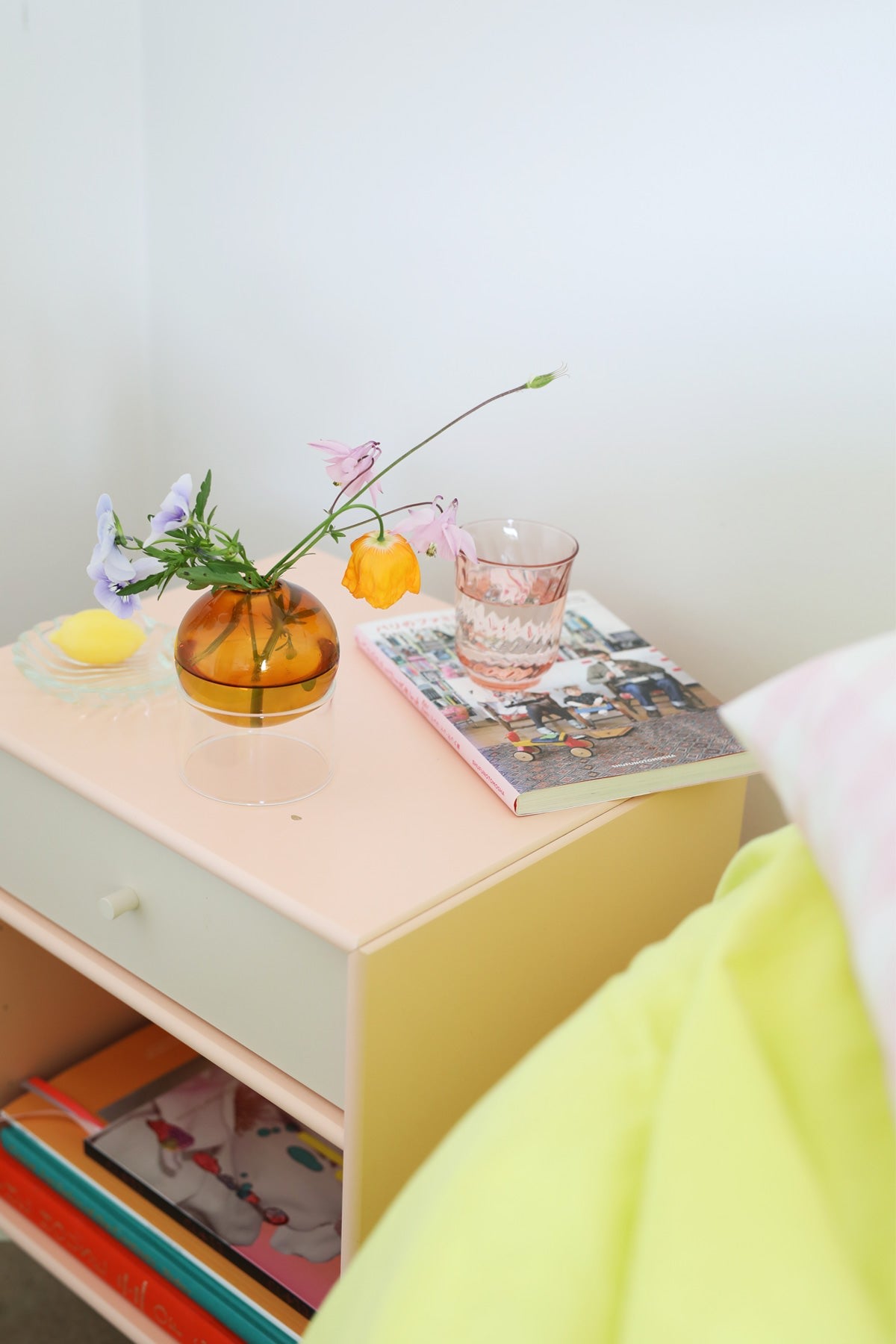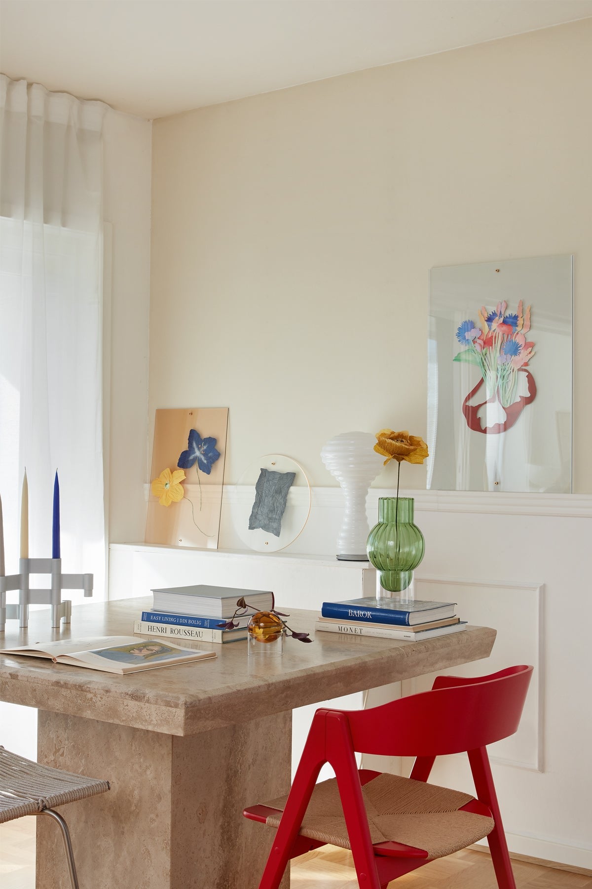 Use the vase with a few simple dark montbretia for a tone-on-tone look or choose flowers in a contrasting colour for a colourful touch to the decor. You can also replace the classic potted plant with the vase and decorate it with small green cuttings that can get lots of light inside the bubble and thus get optimal conditions to grow its beautiful root system. You get a completely carefree decoration with a few dried flowers or a beautiful handmade paper flower.