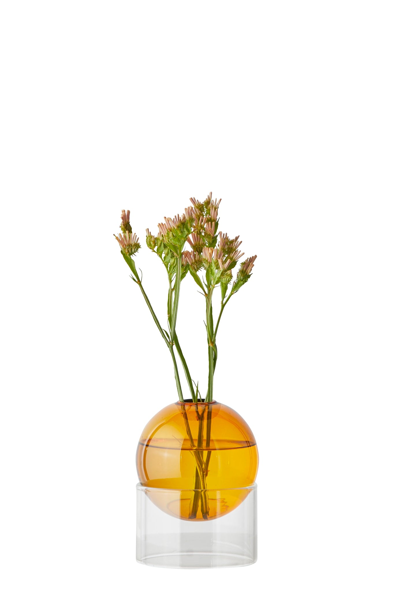 Here, the vase is available in beautiful dark amber reminding you of warm sunshine and Danish beaches. The design of the vase is simple and timeless and is an easy way to bring a splash of colour into the decor. The base of the vase highlights the organic round glass vase and transforms nature's ornaments into a small floating artwork.