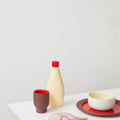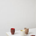 The ceramic cup's expression with the raw terracotta clay on the outside and the red glaze on the inside gives it a raw and elegant look. The small foot on the cup gives it a more airy look and makes it less heavy to look at. The brown and red colors of the ceramic cup make it perfect for setting the coffee table, and it will give the table setting a little pop of color, making it more lively and festive to look at. To complete the perfect table setting, it would be beautiful to mix the ceramic cup with the new ceramic plates, ceramic bowls or one of our other 3 color variants of the ceramic cup. With the small foot on the ceramic cup, they can easily be stacked on top of each other for easy standing.