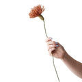 This flower is made from dyed crepe paper and mounted on a long, bendable green stem. You can easily shape the stem, so you can get the shape and length you want. The chrysanthemum originates from Asia and is a symbol of beauty and happiness. It is seen with deeply incised leaves and a large flower head. This variant is in the color Dark Ochre, but it is also available in the color nude.