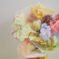 The paper flowers from Studio About are handmade and carefully folded into small tubes. When you receive your flower, unfold the leaves yourself to bring it to life. The crepe paper is easy to shape, so you can adjust the look of the flower and give it a personal touch.