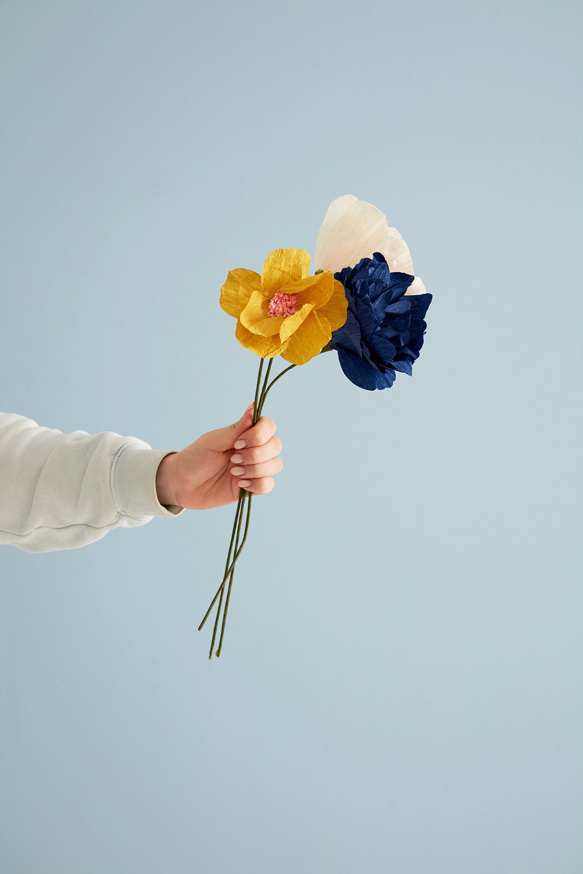 The paper flowers from Studio About are handmade and carefully folded into small tubes. When you receive your flower, unfold the leaves yourself to bring it to life. The crepe paper is easy to shape, so you can adjust the look of the flower and give it a personal touch.