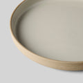 SERVING DISH is a new addition to Studio About's CLAYWARE series made of colorful clay. The serving dish in sand/grey is made of clay and is partially glazed with a raw, sandy-colored exterior and a glazed grey interior. It has a low rim, making it perfect as a serving dish.