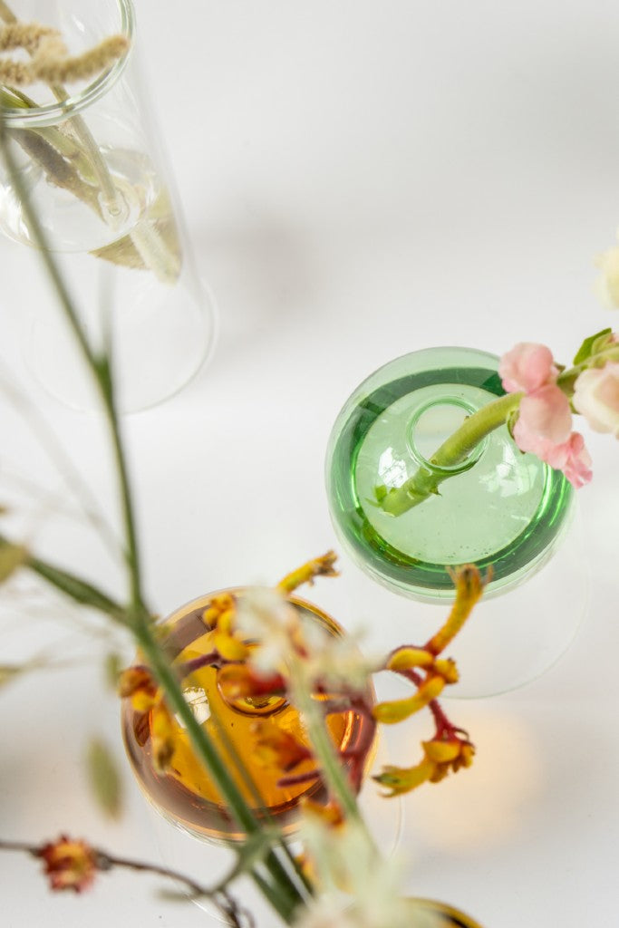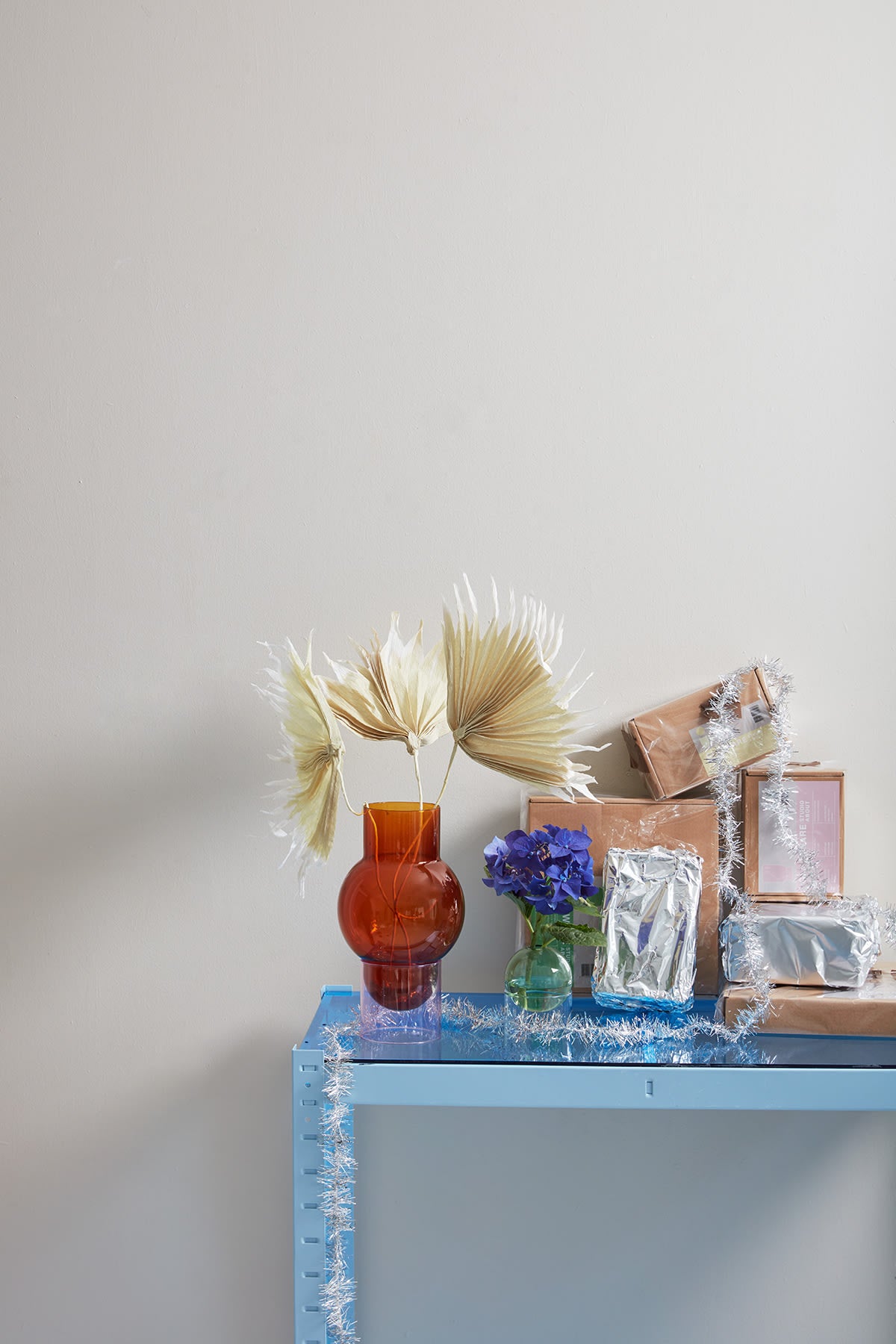 The bubble vase is mouth-blown in solid-coloured borosilicate glass, which is a particularly durable and scratch-free type of glass that can withstand high temperatures and stay neat over time. With ordinary cleaning, the vase will retain its beautiful shine and colour - if you choose a place in the sun, you can even enjoy its beautiful coloured reflections.