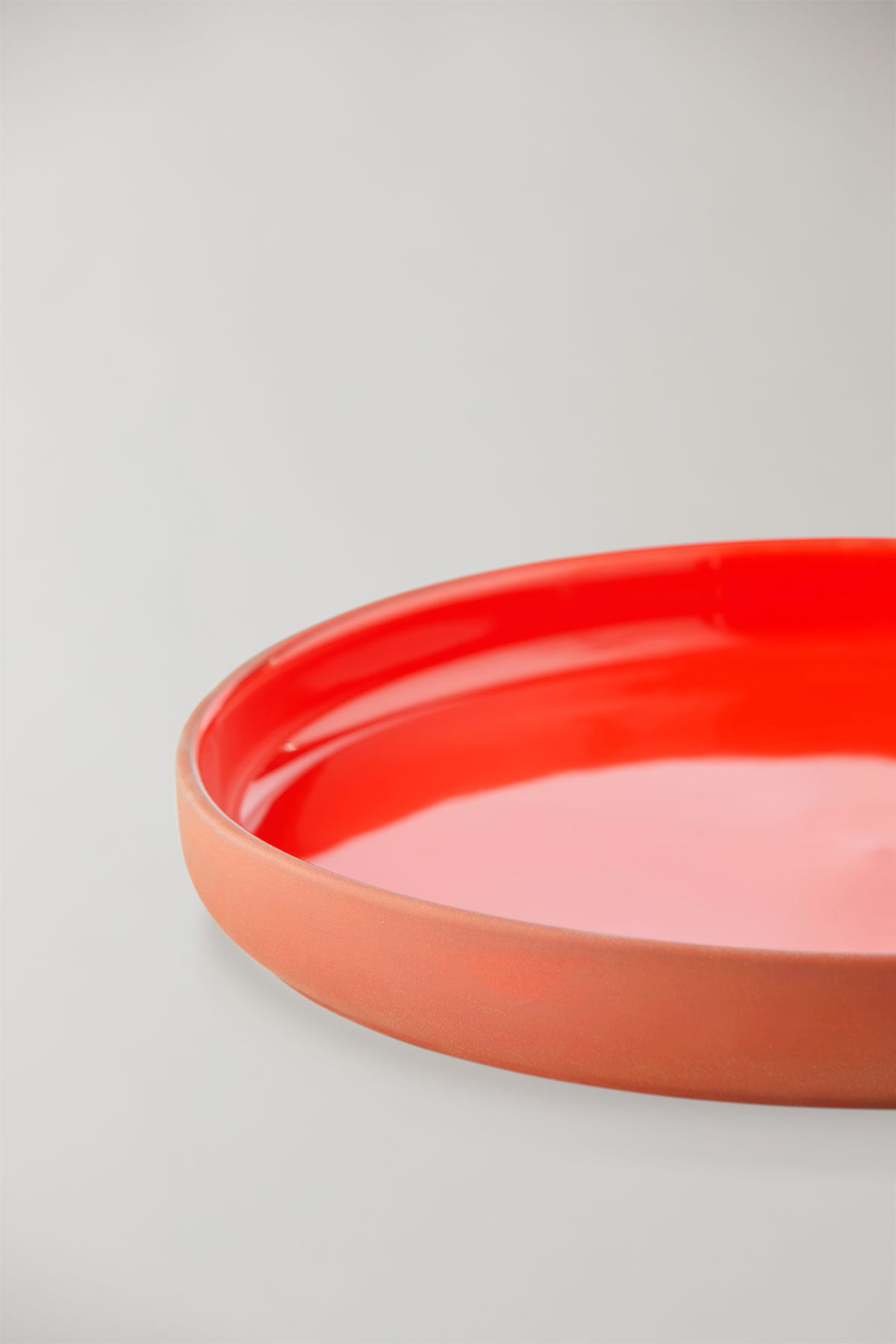 The serving dish in terracotta/red is made of clay and is partially glazed. The dish has a raw exterior in the beautiful terracotta clay, and on its interior, it features a lovely red glaze. The ceramic dish is large and has a low edge, making it perfect for various types of serving.